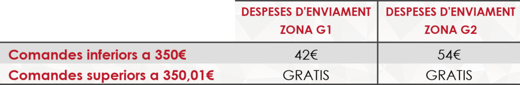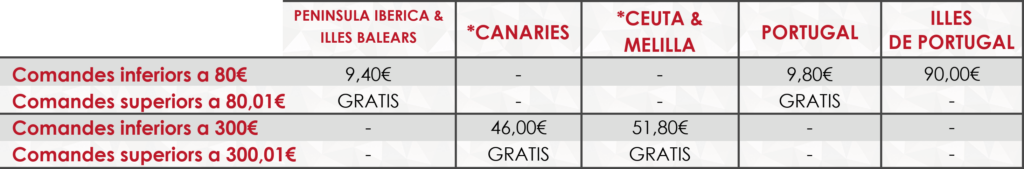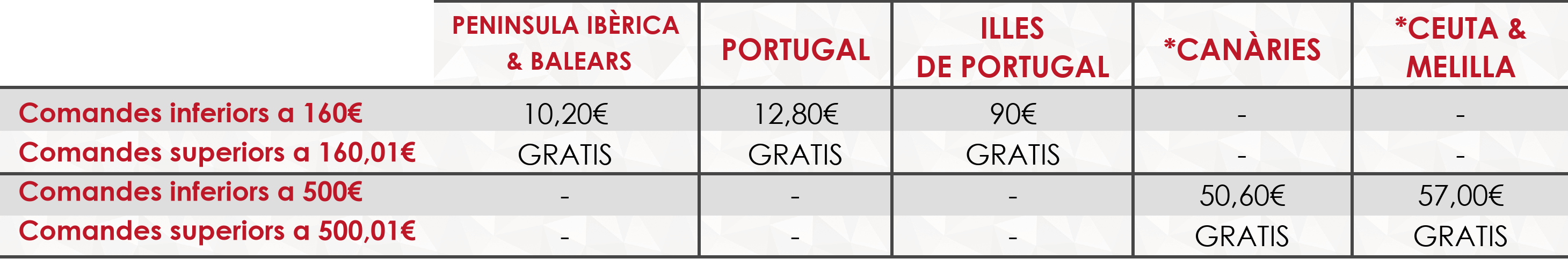 *Per a enviaments a les illes Canàries, Ceuta i Melilla, incloem el cost dels aranzels des d’Espanya en les despeses d’enviament, però les despeses internes que es generen i els impostos de cada una d’aquestes comunitats aniran sempre a càrrec del client.