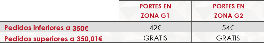 Para envíos dentro de España y Portugal podemos ver el escalado de portes a través de la siguiente tabla: