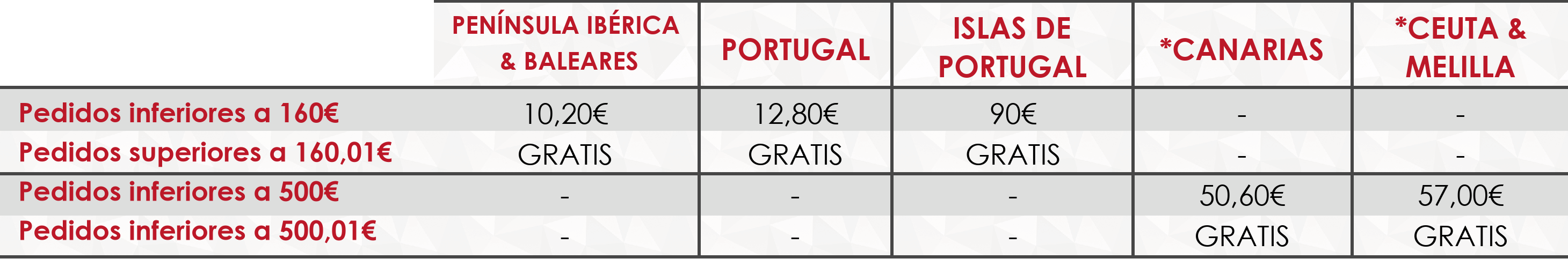 *Para envíos a Canarias, Ceuta y Melilla, incluimos el coste de los aranceles desde España en los portes, pero los gastos internos que se generen e impuestos de cada una de estas comunidades irán siempre a cargo del cliente.